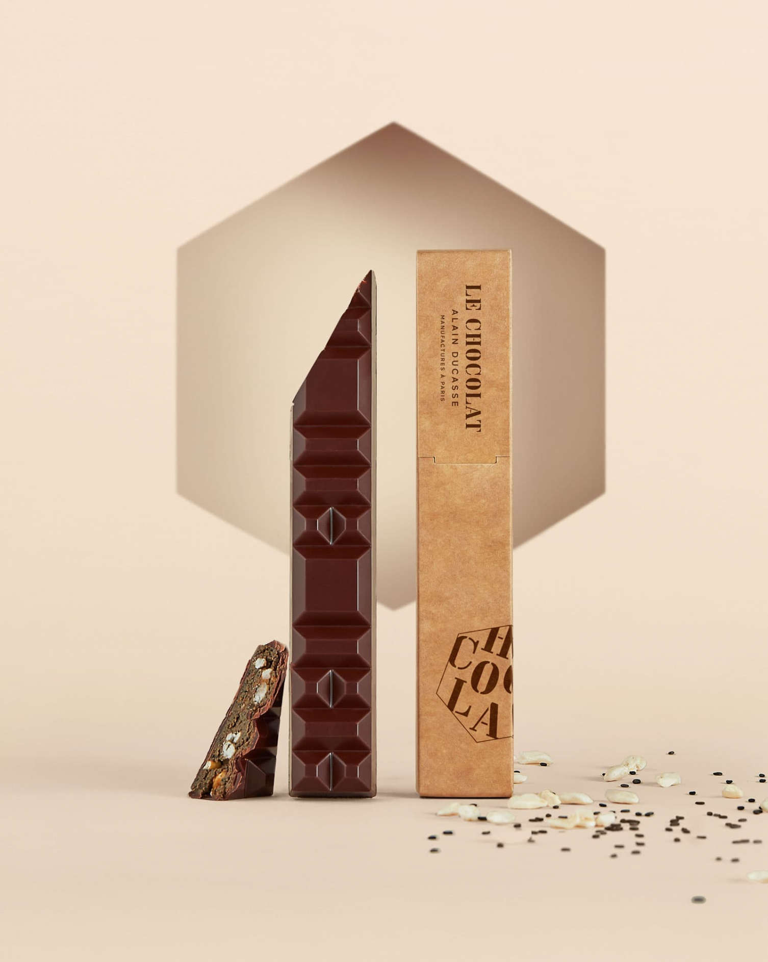 Elle cache en son cœur un praliné sésame noir et amande, du riz soufflé pour le croustillant, le tout enrobé de chocolat noir.