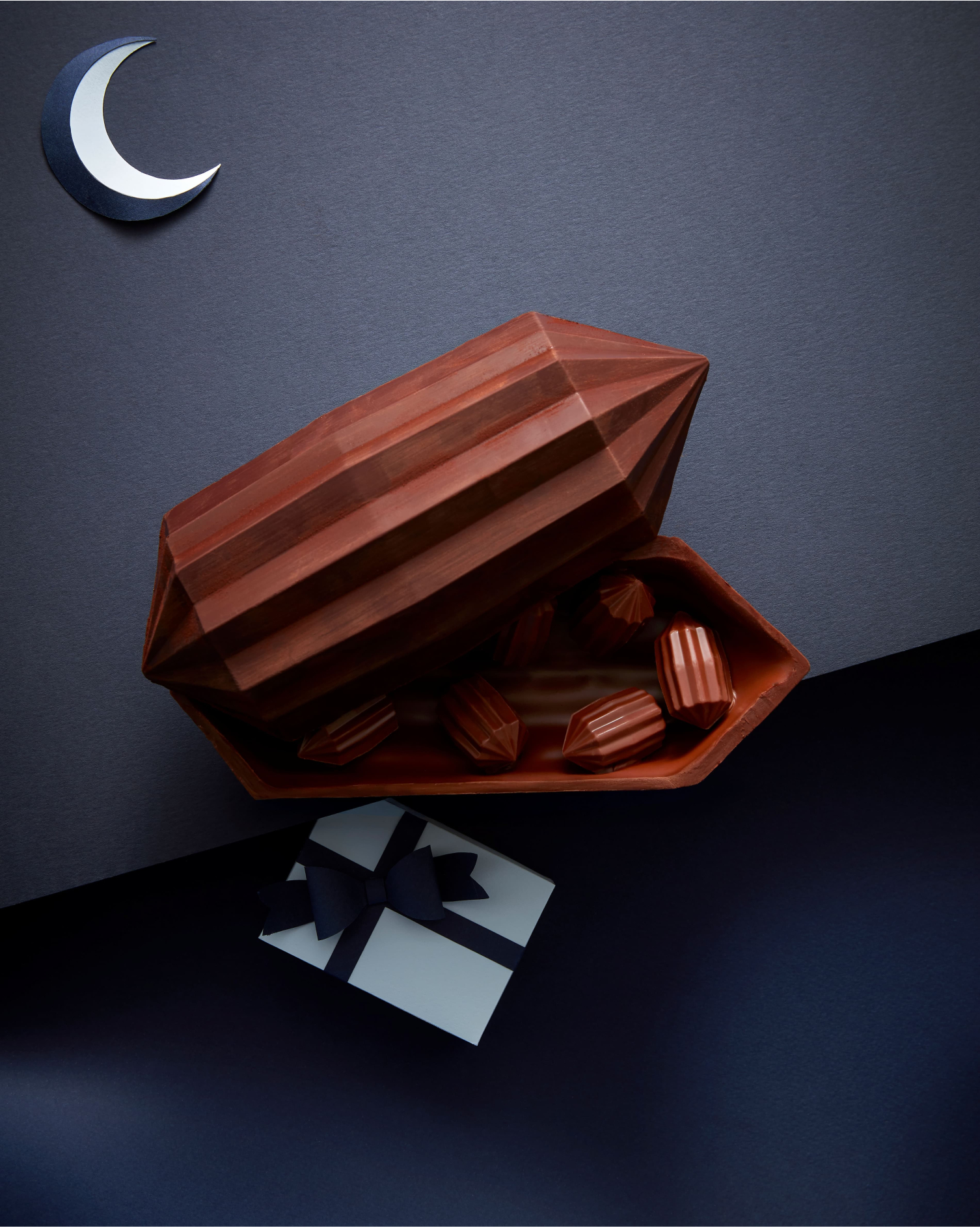 Les bouchées pralinées, intégrées à la coque chocolatée, offrent un délicieux contraste croquant-fondant. Leur praliné au grué de cacao, lisse et onctueux, fond en bouche pour libérer des arômes riches et intenses. Le parfait équilibre entre authenticité et gourmandise.