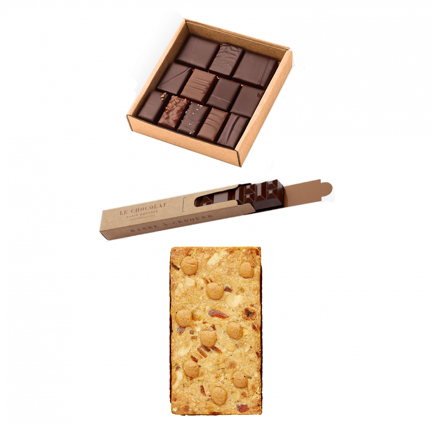 Savourez l'intensité d'une Ganache Origine, le croustillant de la Barre à croquer et le croquant de la tablette Agrume, Amande et Chocolat de la Manufacture de Biscuit.