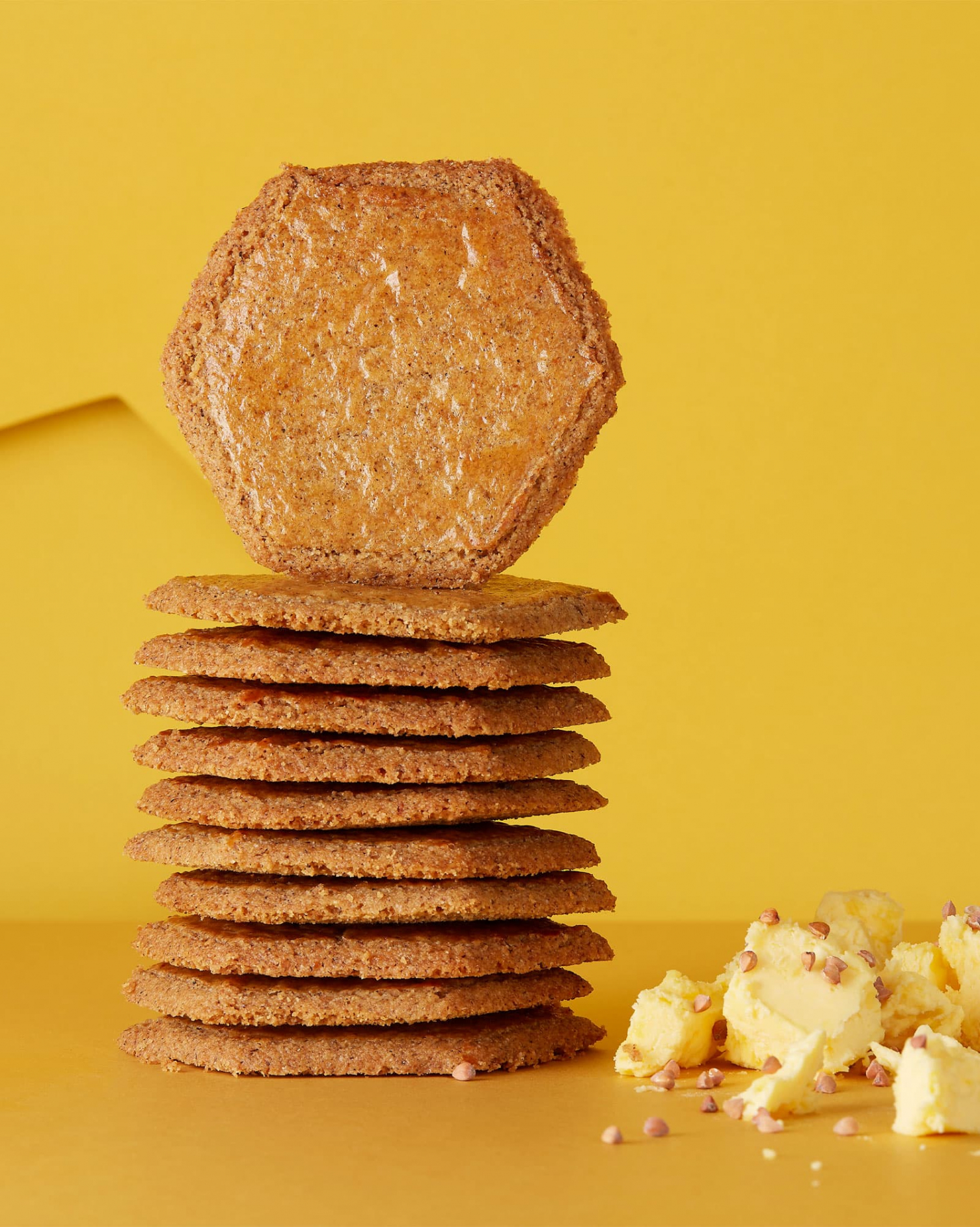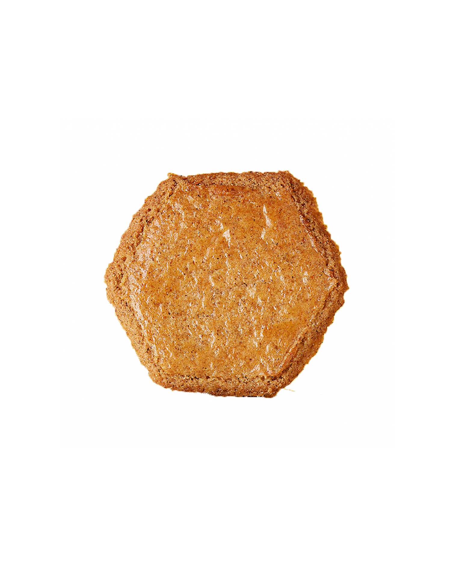 Tous les ingrédients qui le composent sont d'ailleurs un clin d'œil à la région bretonne : la farine de sarrasin, la farine de maïs torréfiée et le beurre demi-sel, tous bio. Le biscuit est friable, marqué en goût beurré, torréfié et de sarrasin. La pâte est bien sûr sablée, et cela se sent à la dégustation ! Le secret de cette texture réside dans l'ordre d'ajout des ingrédients, et du temps de mélange, déterminant dans la conservation d'une certaine friabilité. Un défi technique qui aura demandé de nombreux essais à la chef Flora Davies et son équipe !